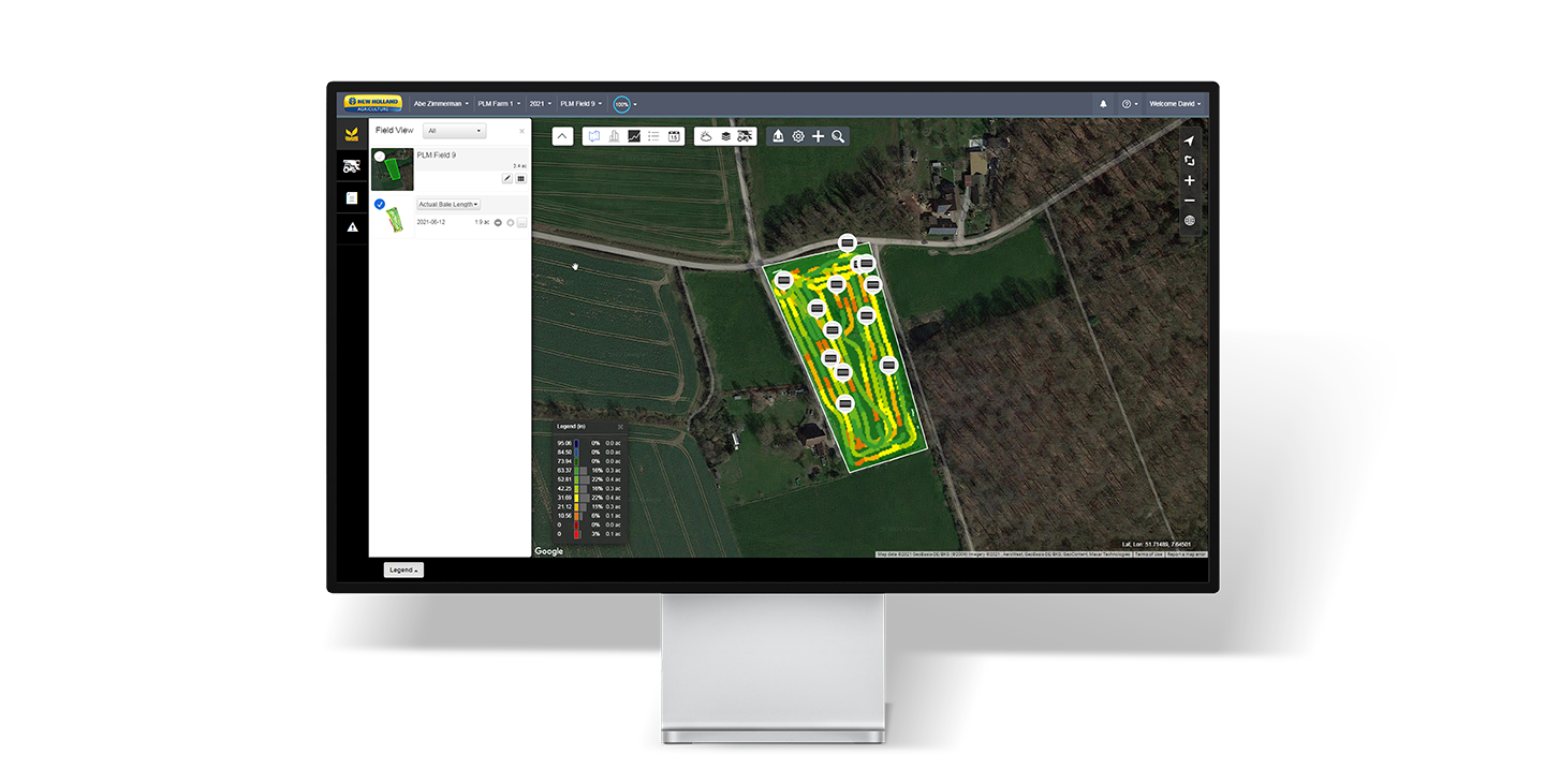 The Farm tab enables visualization of data in the form of a simple coverage map or a multiple layer yield & moisture map, depending on your operation. Data from the SIMA awarded NutriSense system for the ForageCruiser series and CX/CR combine series and bale data from the BigBaler series can even be analyzed. The Farm tab becomes the single location to store your field data for record keeping both for Farm management and regulatory purposes